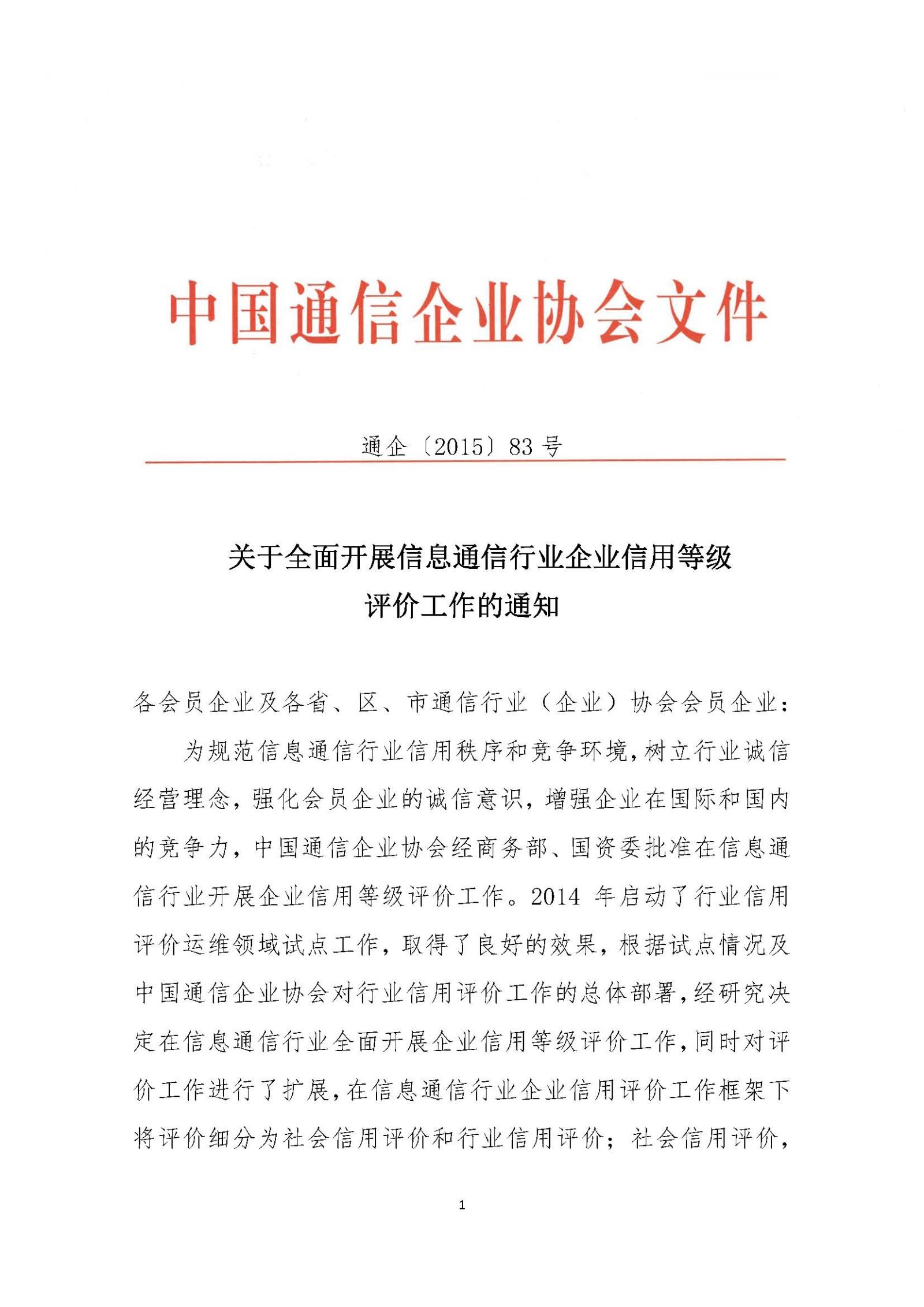 附件:1.关于全面开展信息通信行业企业信用等级评价工作的通知(通企[2015]83号)