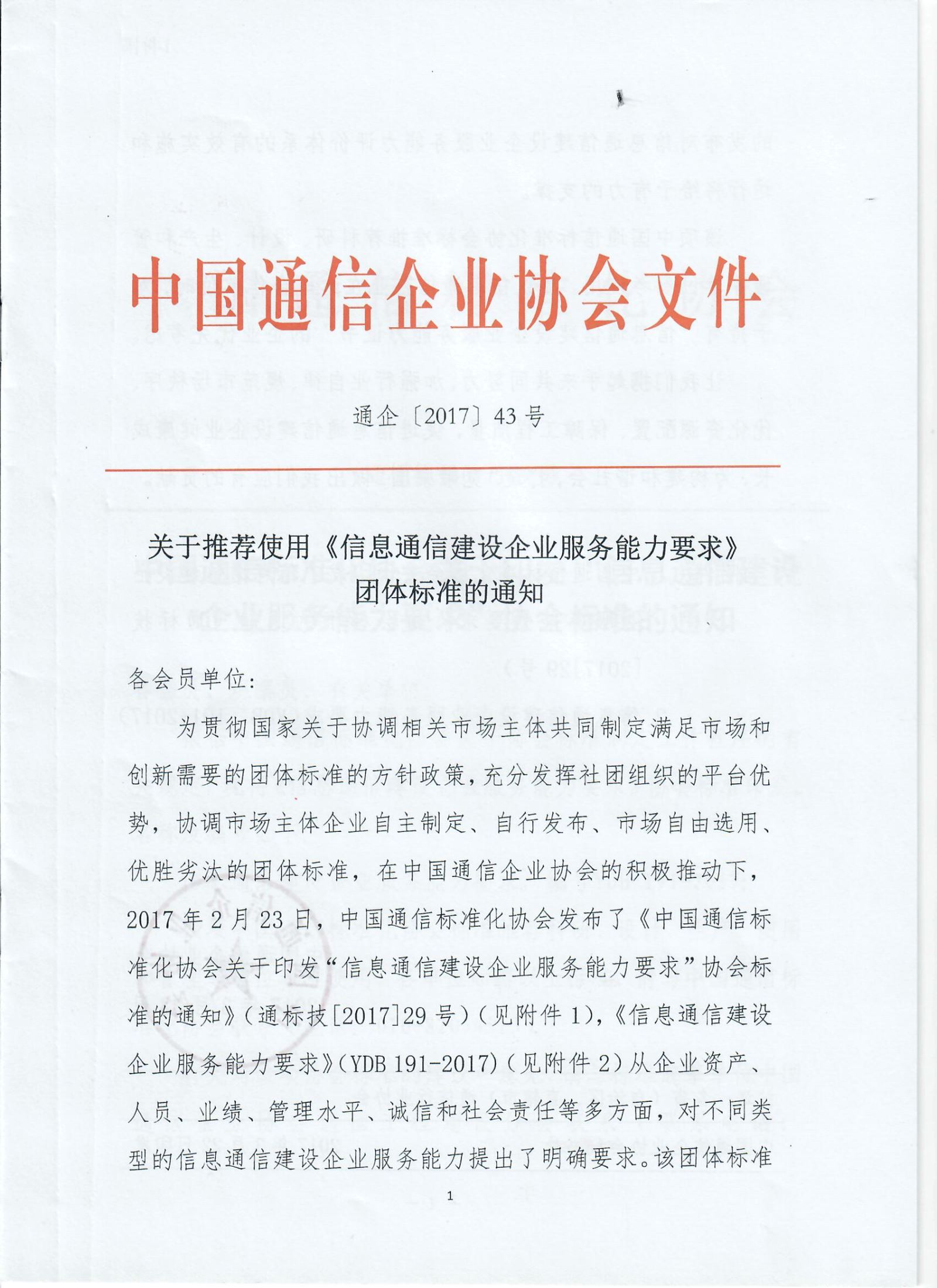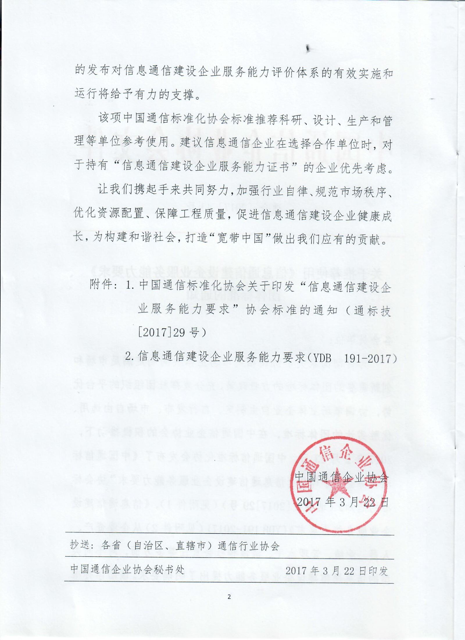 附件:1.中国通信标准化协会关于印发“信息通信建设企业服务能力要求”协会标准的通知