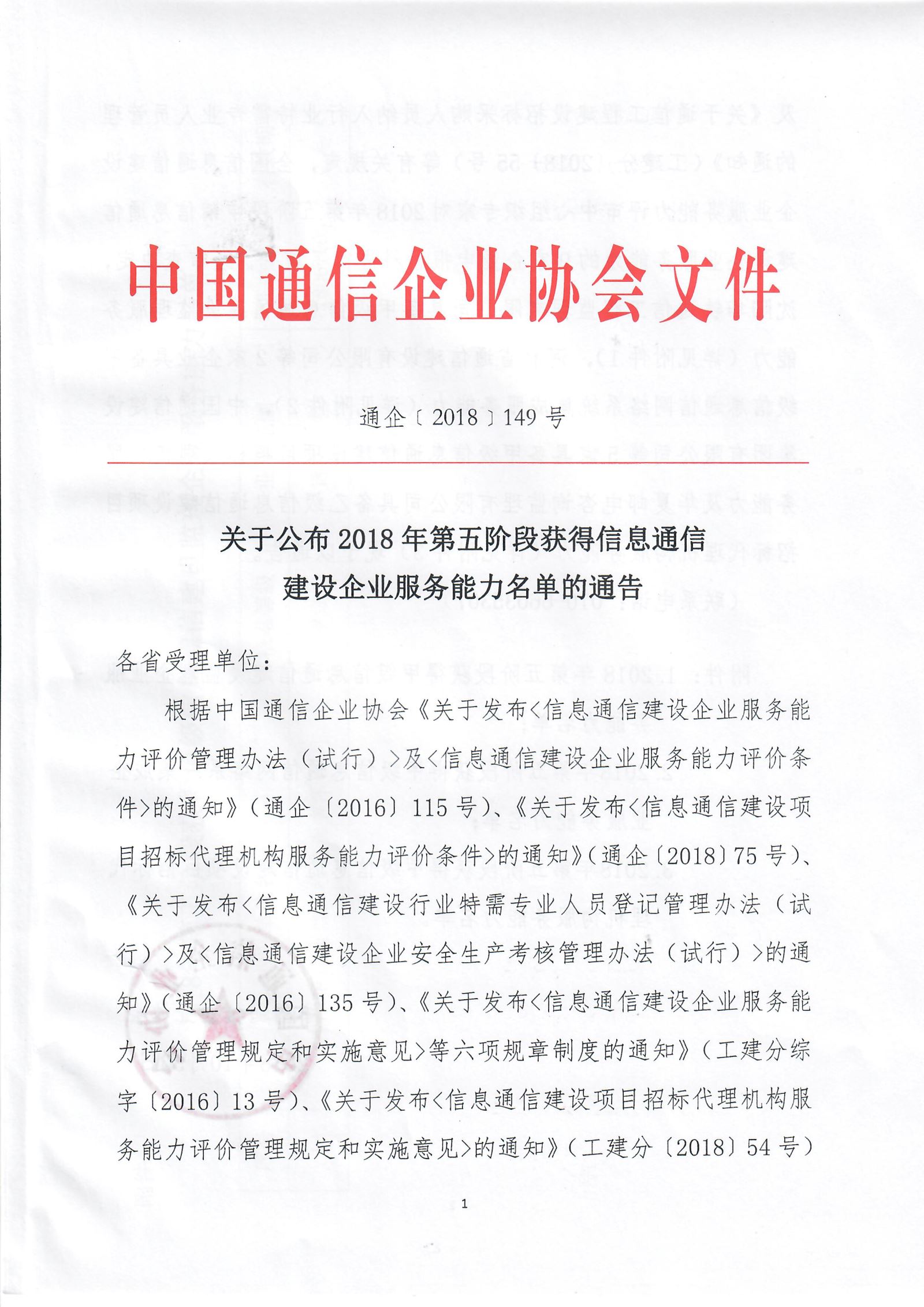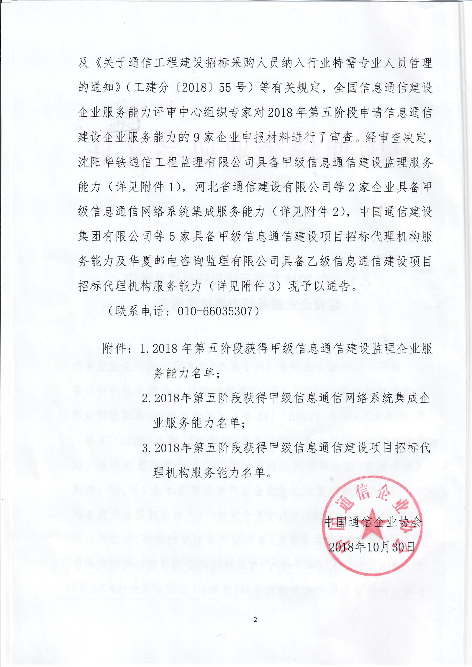 关于公布2018年第五阶段获得信息通信建设企业服务能力名单的通告