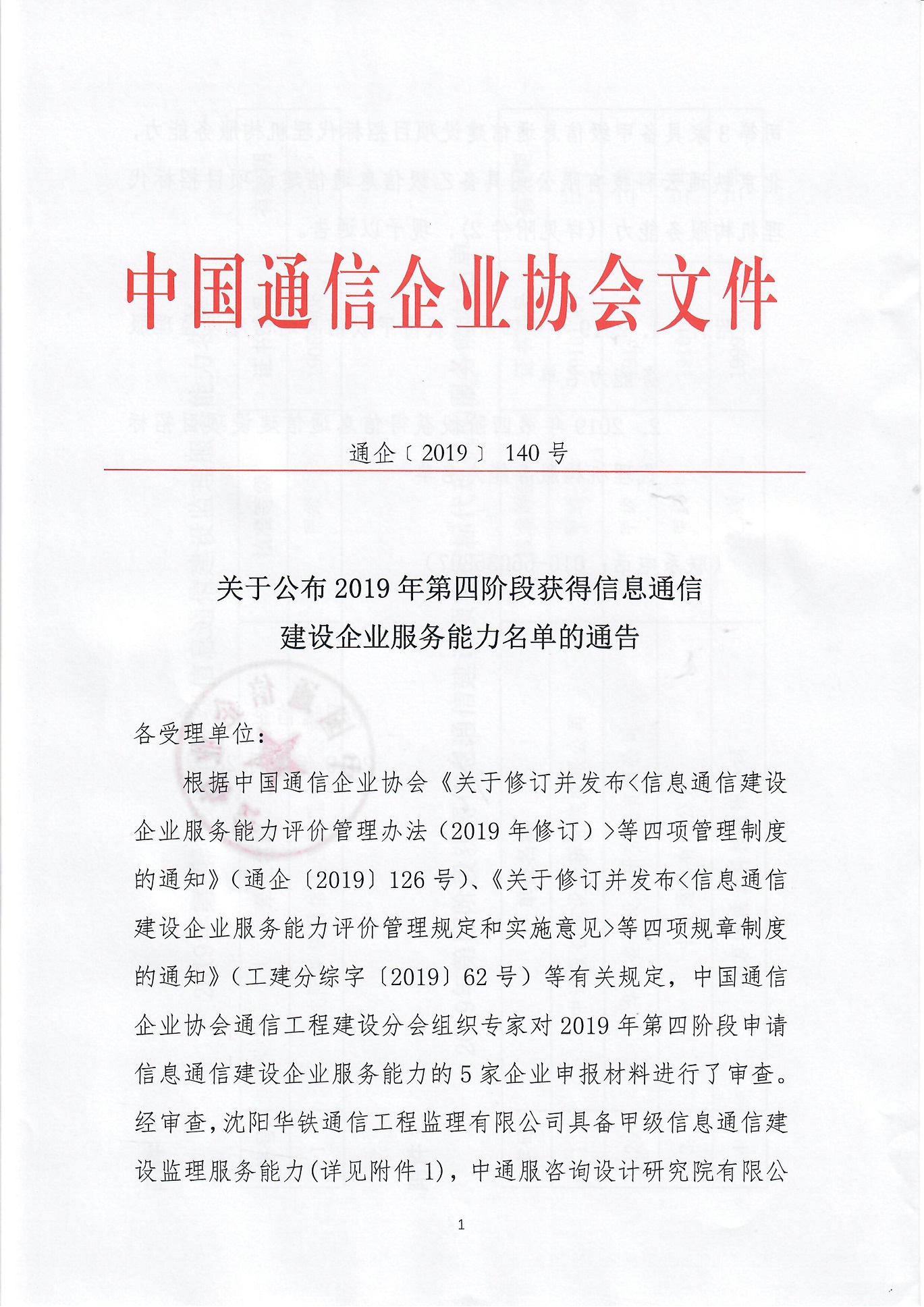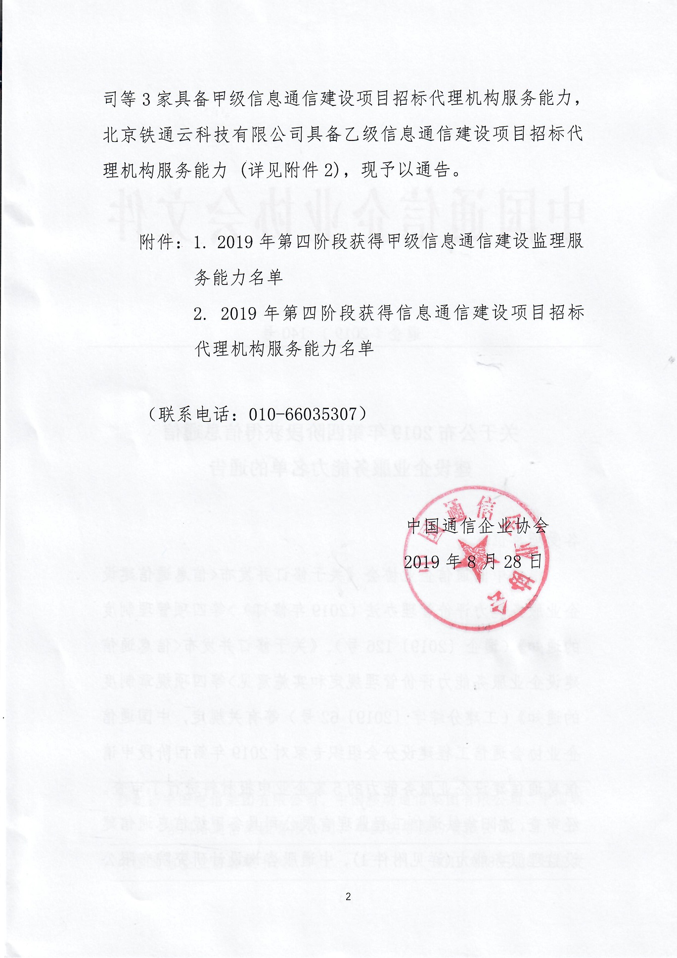 关于公布2019年第四阶段获得信息通信建设企业服务能力名单的通告