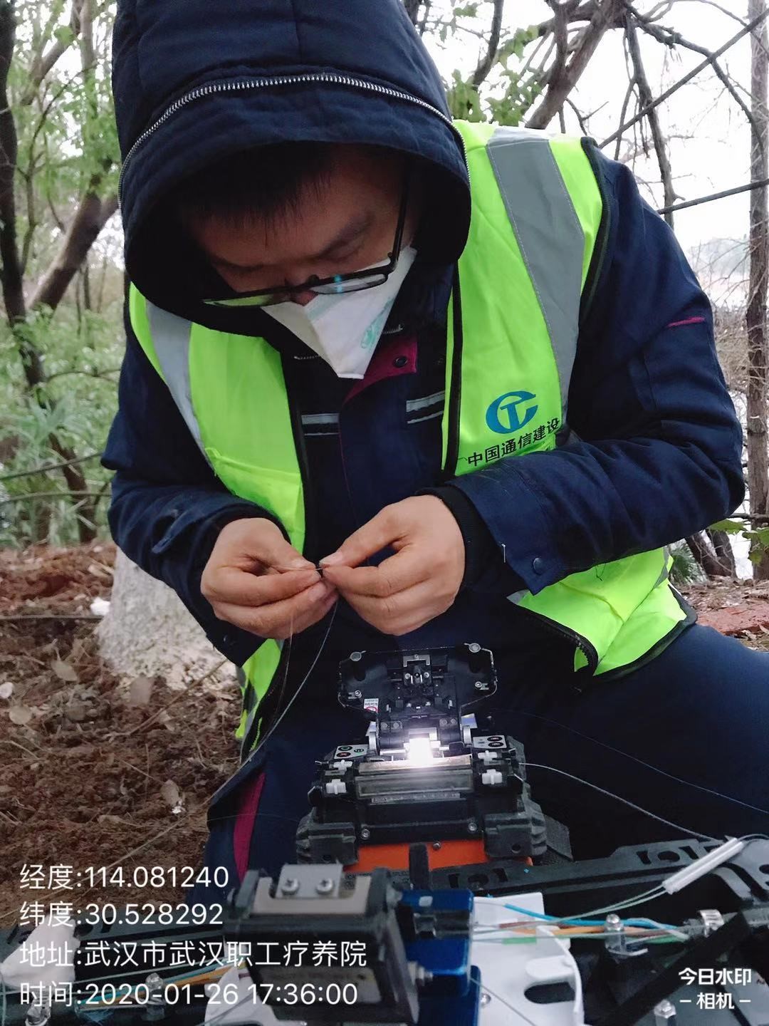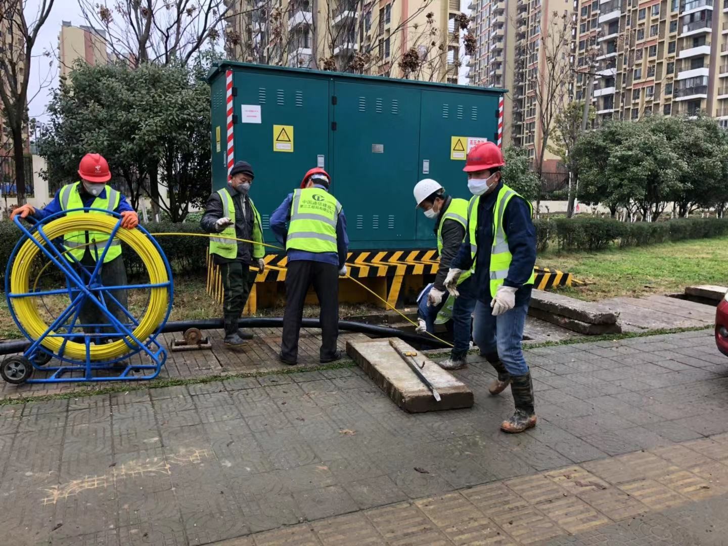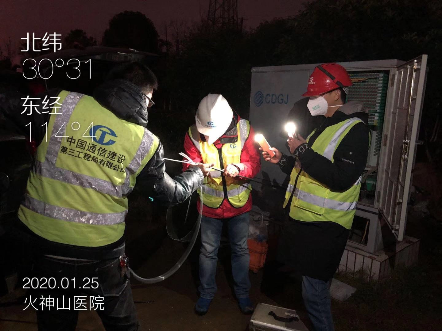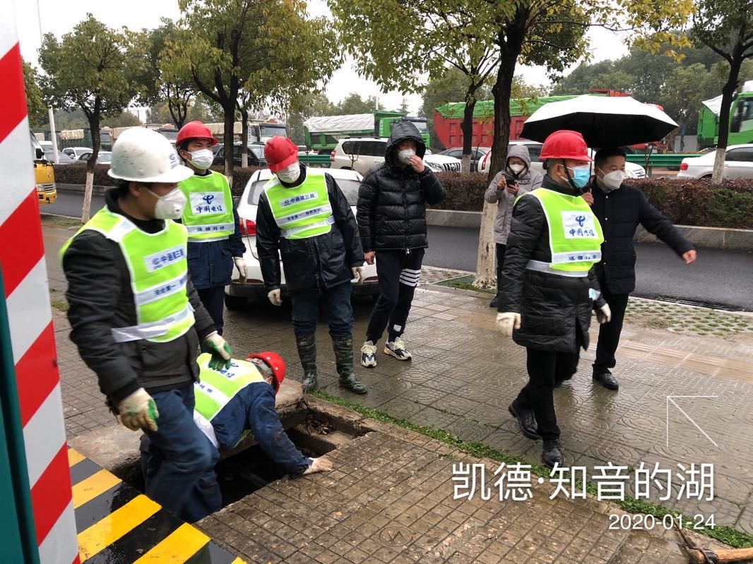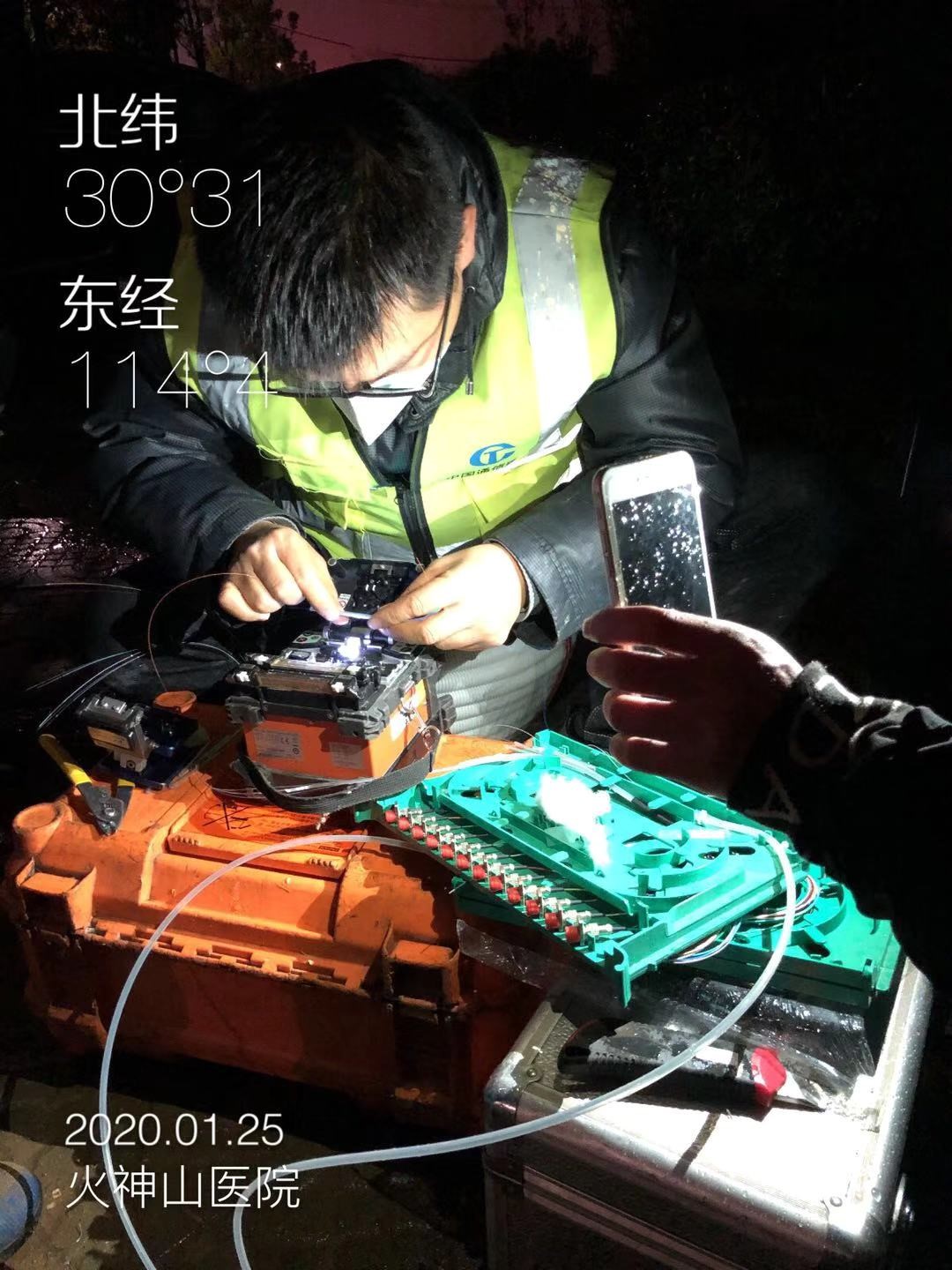 1月25日,大年初一,公司所属第十六分公司响应武汉移动在火神山医院建立5G基站的要求,派出17人到施工现场,连续奋战两天,进行光缆布放和线路迁改割接工作,为火神山医院基站开通打通传输通道,公司党委书记、总经理魏枫亲自前往施工现场指导施工。
