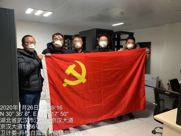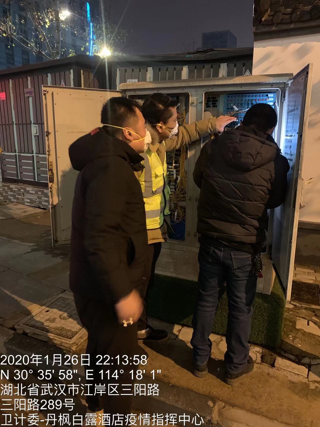 1月26日,第十六分公司又派出4名技术人员前往武汉市疫情指挥中心所在的丹枫白露酒店,连夜奋战,进行临时线缆布放、跳纤、设备安装及调测开通,为指挥中心开通专线,保障了疫情指挥的通信通畅。