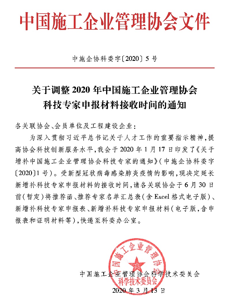 关于调整2020年中国施工企业管理协会科技专家申报材料接收时间的通知——中施企协科委字〔2020〕5号