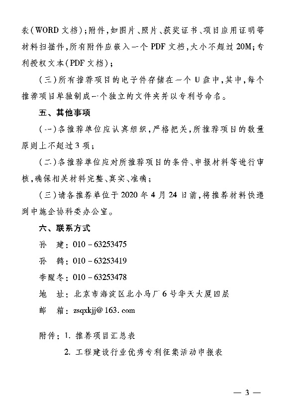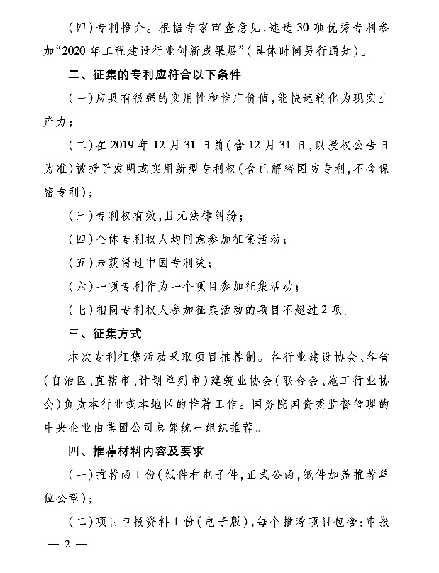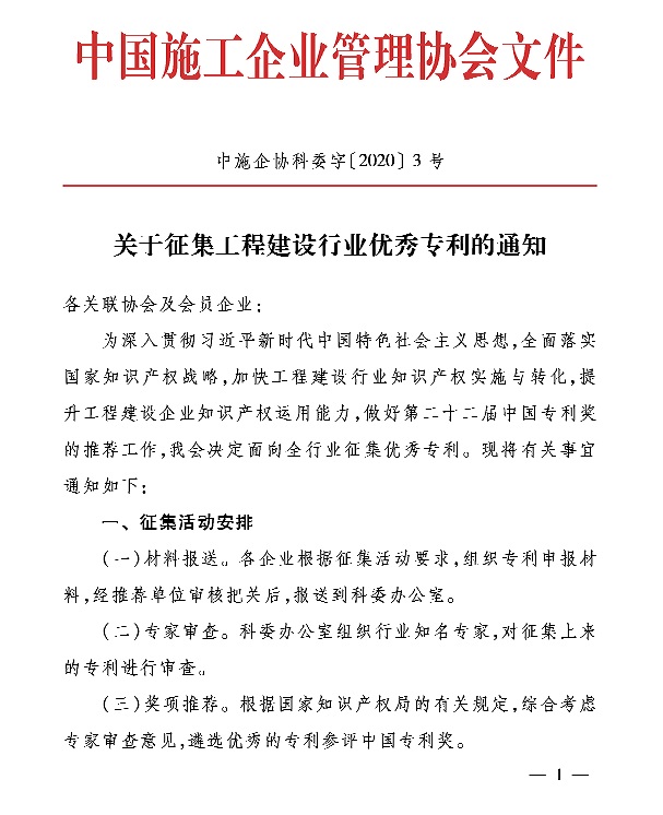 关于征集工程建设行业优秀专利的通知 中施企协科委字〔2020〕3号