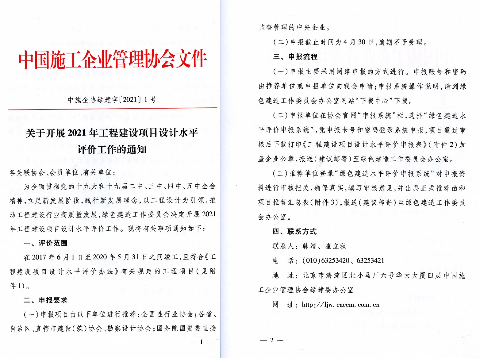 中施企协绿建字〔2021〕1号“关于开展2021年工程建设项目设计水平评价工作的通知”