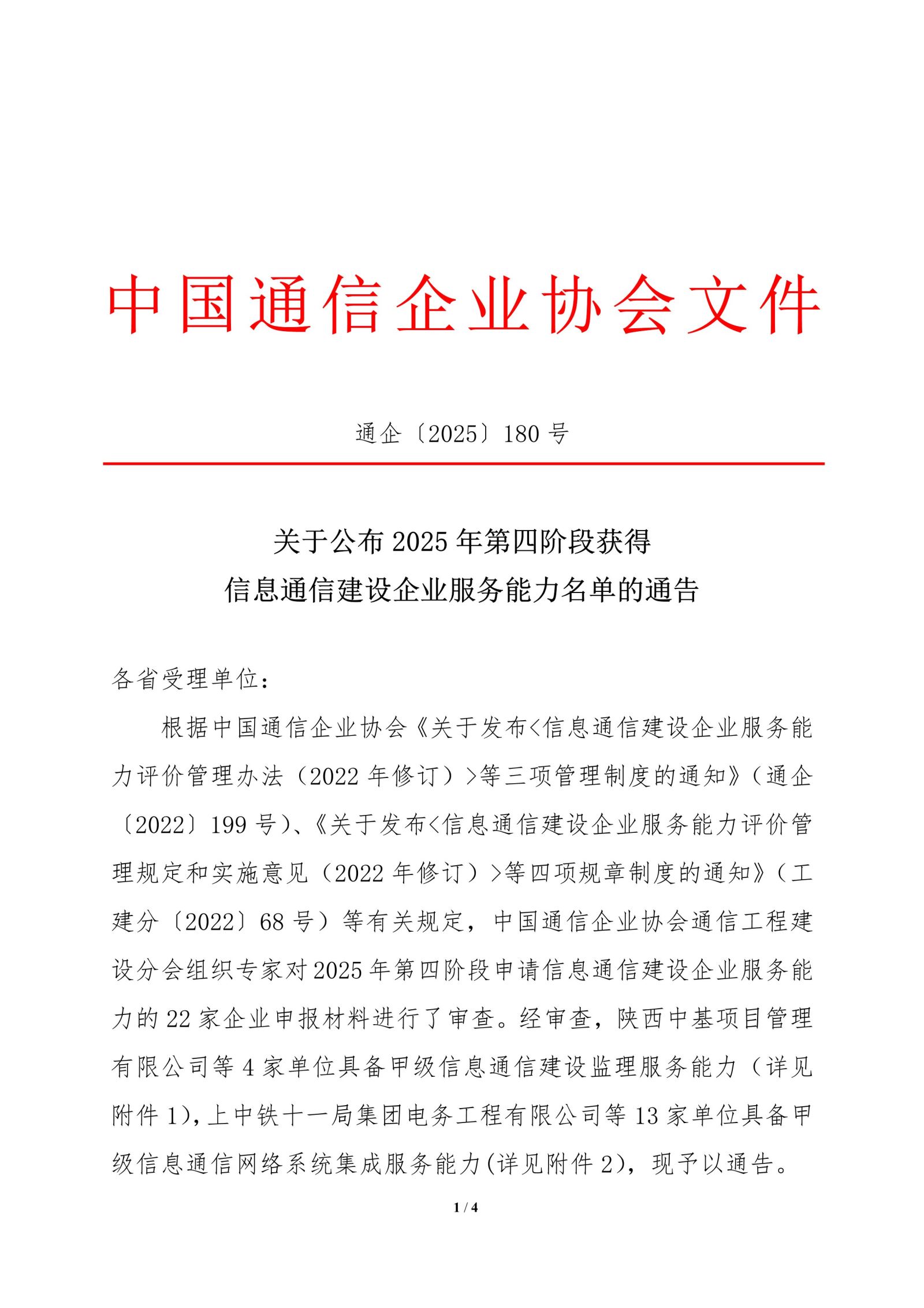 关于公布2025年第四阶段获得信息通信建设企业服务能力名单的通告
